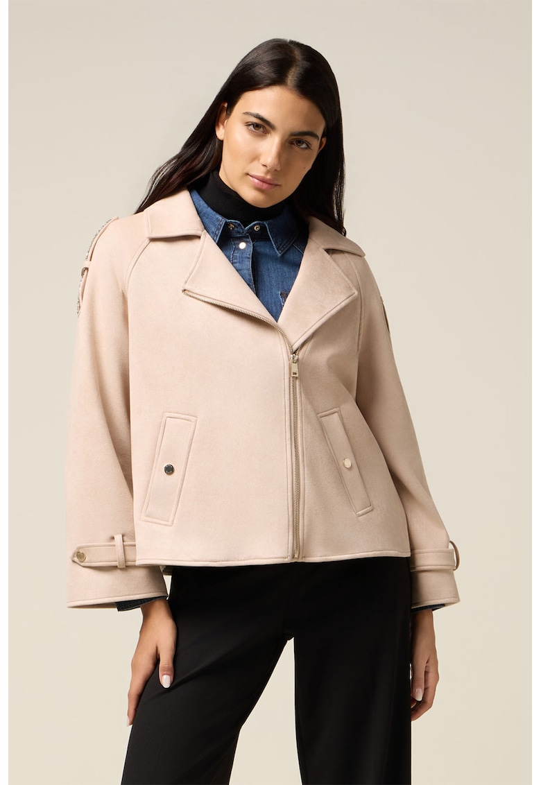 Caracteristici Tip produs: jacheta Culoare: piersica Imprimeu: uni Material: poliester Croiala: supradimensionat Gluga: fara gluga Maneci: cazute Lungime maneca: maneca lunga Sistem inchidere: fermoar Compozitie Exterior: 93% poliester