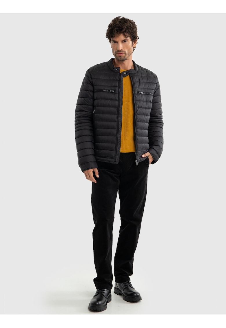 Caracteristici Tip produs: jacheta Culoare: negru Material: sintetic Croiala: regular fit Imprimeu: uni Gluga: fara gluga Guler: scurt Lungime maneca: maneca lunga Buzunare: cu fermoar Detalii: aspect matlasat Sistem inchidere: fermoar Compozitie Exterior: 100% poliamida