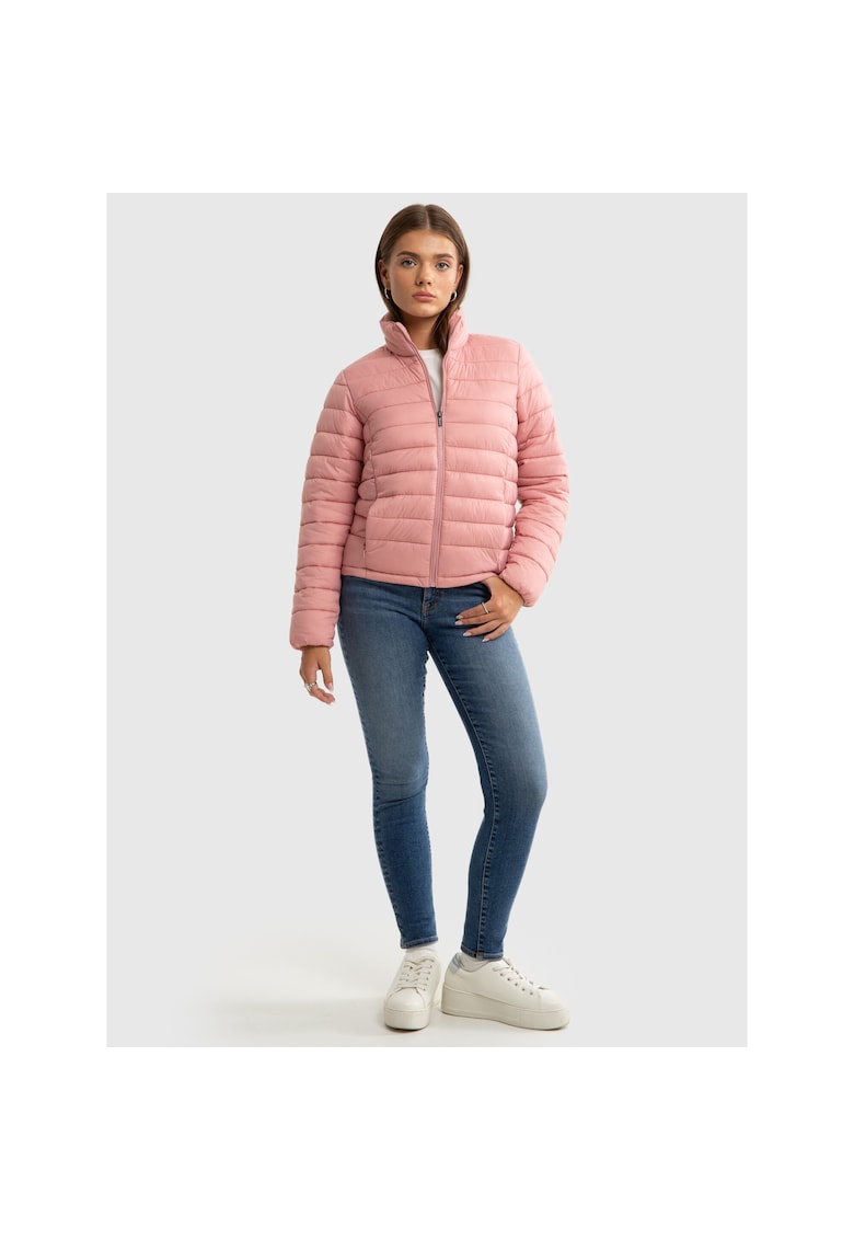 Caracteristici Tip produs: jacheta Culoare: piersica Imprimeu: uni Croiala: regular fit Material: sintetic Lungime: scurta Guler: mediu Buzunare: 2 Lungime maneca: maneca lunga Detalii: aspect matlasat Colectie: primavara
