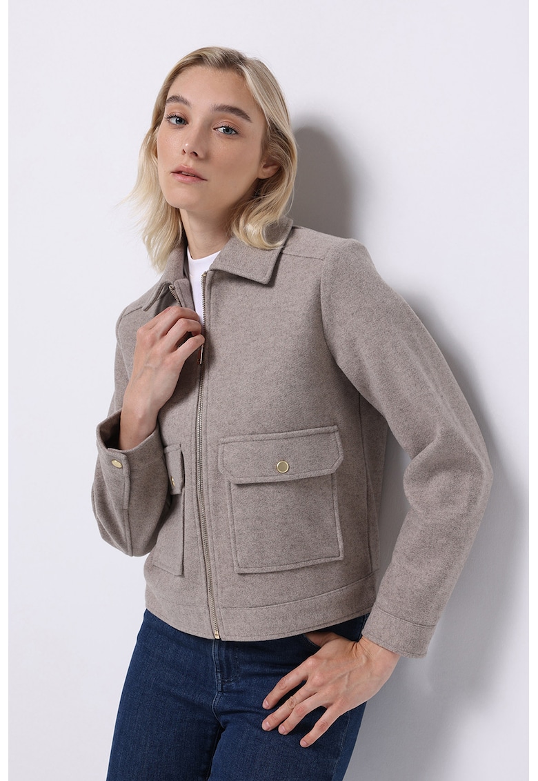 Caracteristici Tip produs: jacheta Culoare: gri melange Imprimeu: uni Material: sintetic Croiala: regular fit Guler: clasic Gluga: fara gluga Maneci: mansete cu capse Lungime maneca: maneca lunga Buzunare: cu clape cu capse Sistem inchidere: fermoar Compozitie Exterior: 91% poliester