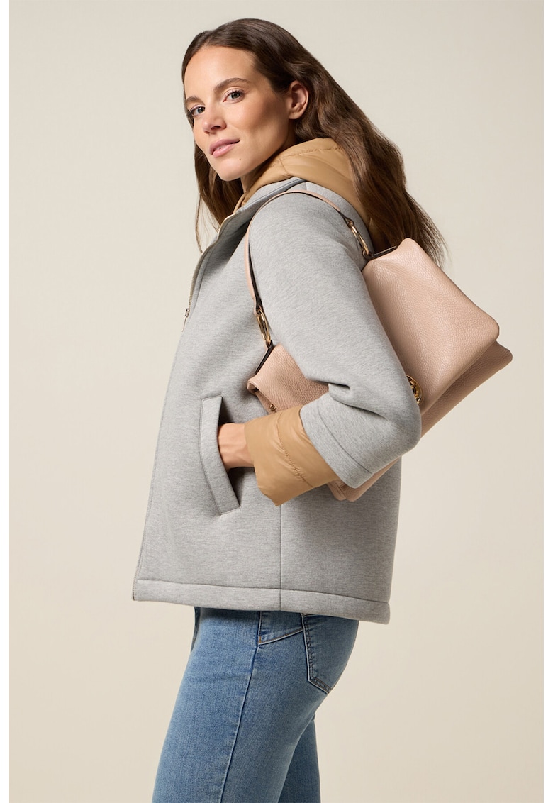 Caracteristici Tip produs: jacheta Culoare: gri melange Imprimeu: uni Material: viscoza Croiala: regular fit Gluga: cu gluga Lungime maneca: maneca lunga Buzunare: buzunare in lateral Detalii: design 2 in 1 Sistem inchidere: fermoar Compozitie Exterior: 96% viscoza