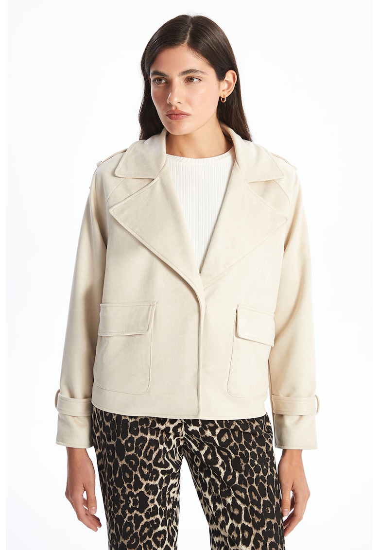 Caracteristici Tip produs: jacheta Culoare: bej deschis Imprimeu: uni Material: sintetic Croiala: regular fit Guler: cu revere Gluga: fara gluga Lungime maneca: maneca lunga Sistem inchidere: capse Compozitie Exterior: 94% poliester