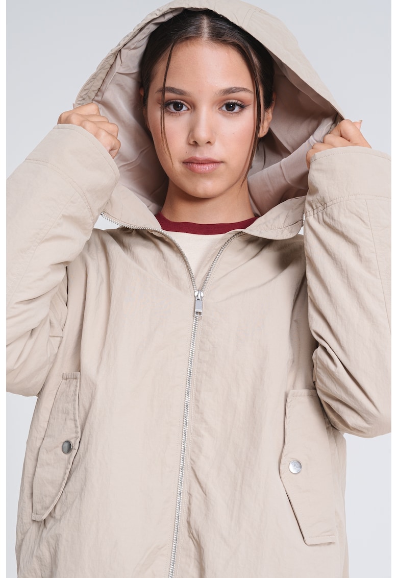 Caracteristici Tip produs: jacheta Culoare: maro nisip Imprimeu: uni Material: nylon Croiala: regular fit Gluga: cu gluga Lungime maneca: maneca lunga Sistem inchidere: fermoar Compozitie Exterior: 100% nailon Info model Modelul poarta un produs de marimea S. Marimi model: 174 cm inaltime