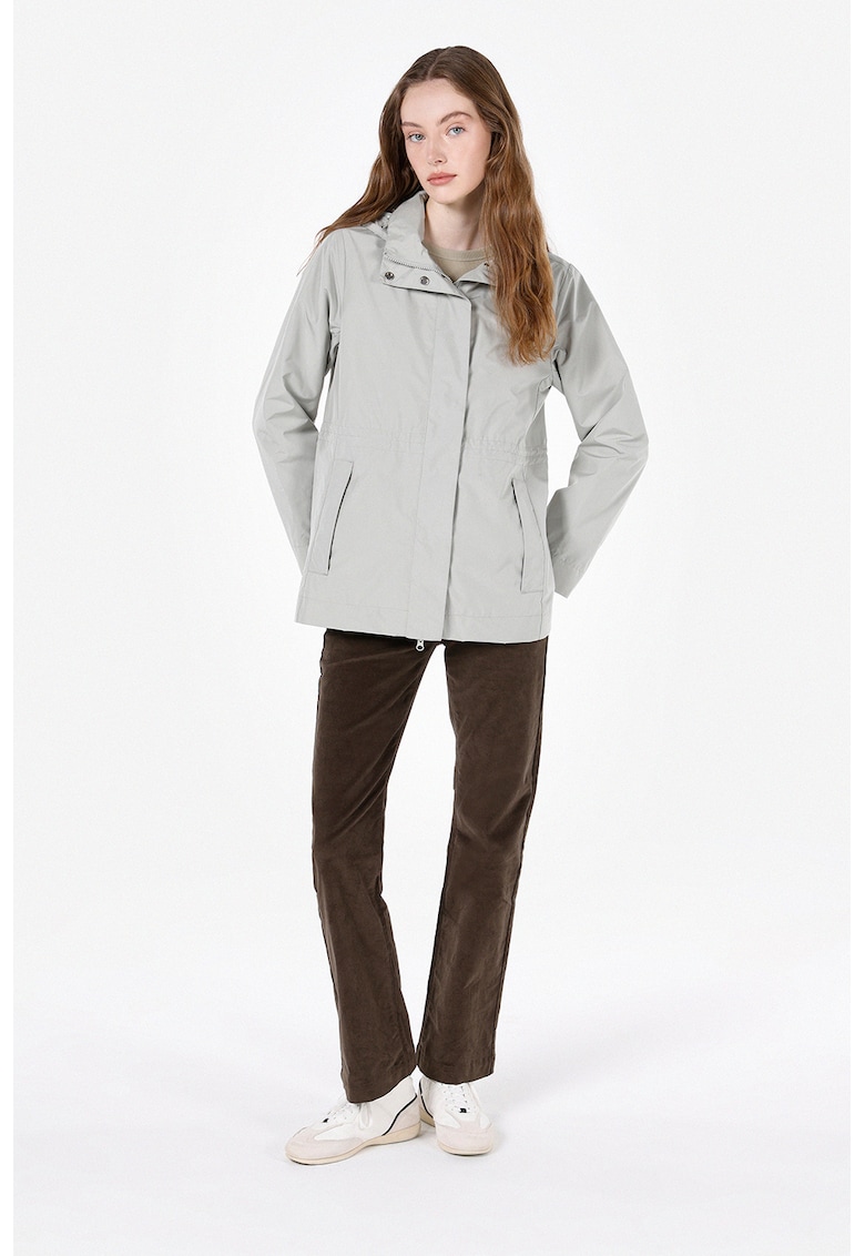 Caracteristici Tip produs: jacheta Culoare: gri deschis Imprimeu: uni Material: sintetic Croiala: regular fit Guler: inalt Gluga: cu gluga Lungime maneca: maneca lunga Buzunare: 2 laterale Sistem inchidere: fermoar