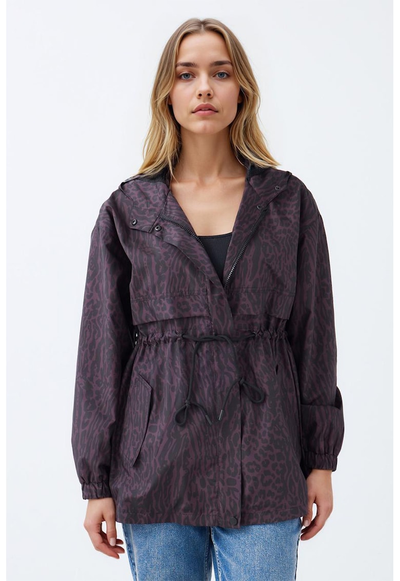 - violet pruna Imprimeu: animal print Material: poliester Croiala: regular fit Gluga: cu gluga Lungime maneca: maneca lunga Sistem inchidere: fermoar