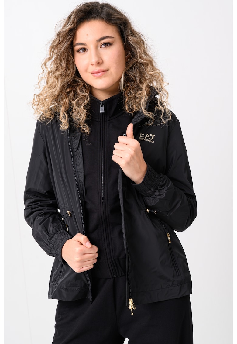 Caracteristici Tip produs: jacheta Culoare: negru stins Imprimeu: uni Material: poliester Gluga: cu gluga Lungime maneca: maneca lunga Buzunare: buzunare laterale Sistem inchidere: fermoar Compozitie Exterior: 100% poliester Captuseala: 100% poliester Info model Modelul poarta un produs de marimea S. Marimi model: 178 cm inaltime