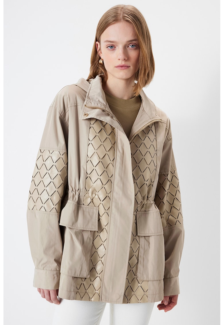 Caracteristici Tip produs: jacheta Culoare: maro taupe deschis Imprimeu: uni Material: poliester Croiala: regular fit Gluga: cu gluga Lungime maneca: maneca lunga Buzunare: 2 cu clapa Detalii: talie ajustabila Sistem inchidere: fermoar