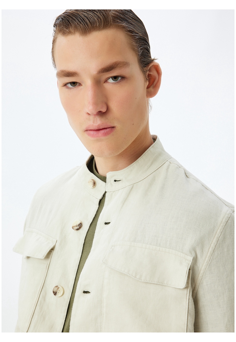 Caracteristici Tip produs: jacheta Culoare: bej Material: in Croiala: regular fit Imprimeu: uni Gluga: fara gluga Guler: mao Lungime maneca: maneca lunga Buzunare: 4 exterioare Sistem inchidere: nasturi Compozitie Exterior: 100% in Captuseala: 78% poliester