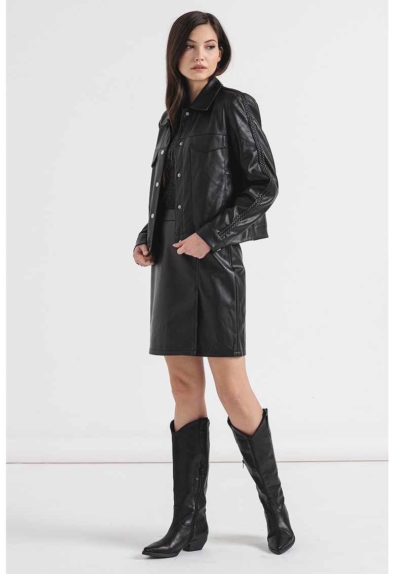 Caracteristici Tip produs: jacheta Culoare: negru Imprimeu: uni Material: piele ecologica Croiala: regular fit Gluga: fara gluga Lungime maneca: maneca lunga Buzunare: 2 cu clapa pe piept Sistem inchidere: capse Compozitie Exterior: 100% poliamida cu strat exterior de poliuretan Info model Modelul poarta un produs de marimea 36. Marimi model: 176 cm inaltime