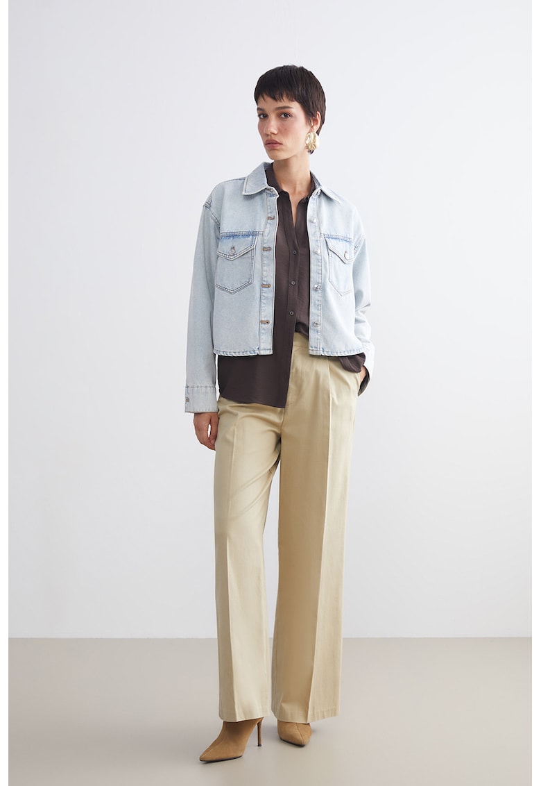Caracteristici Tip produs: jacheta Culoare: albastru deschis Imprimeu: uni Material: denim Croiala: regular fit Guler: ascutit Gluga: fara gluga Lungime maneca: maneca lunga Buzunare: 2 cu clapa pe piept Sistem inchidere: nasturi Compozitie Exterior: 69% bumbac