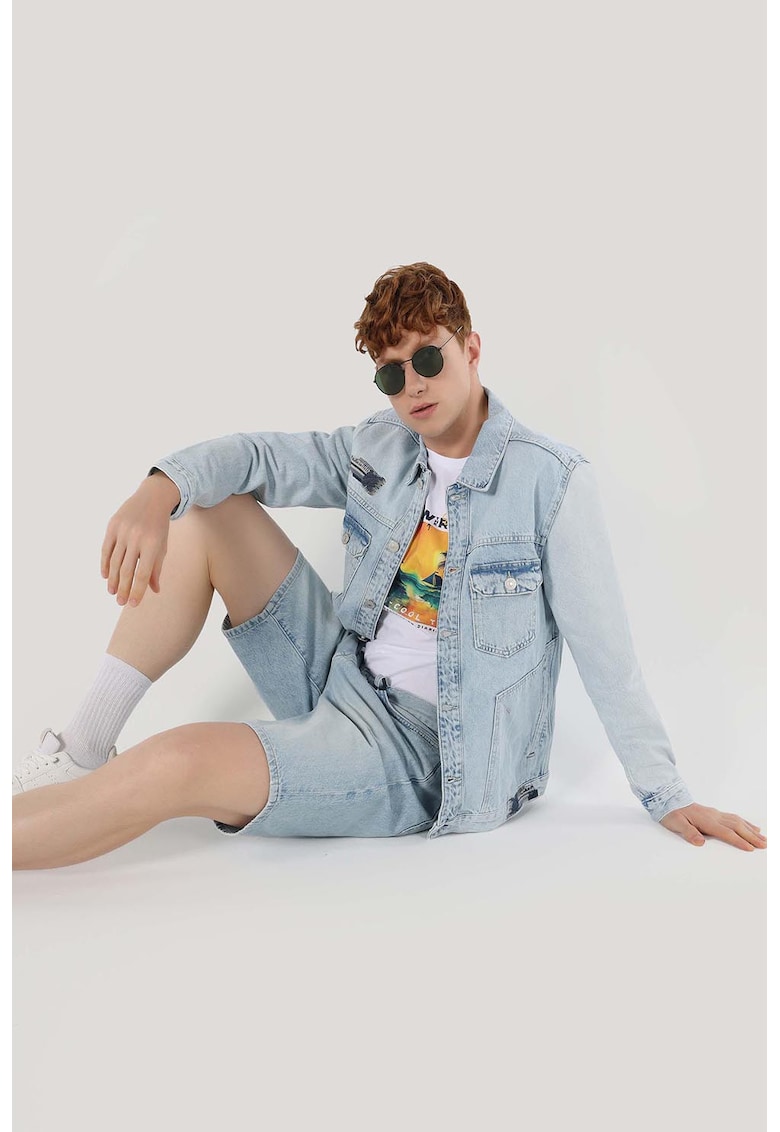 Caracteristici Tip produs: jacheta Culoare: albastru glaciar Material: denim Croiala: regular fit Imprimeu: uni Gluga: fara gluga Guler: clasic Maneci: cu mansete cu nasturi Lungime maneca: maneca lunga Buzunare: cu clapa cu nasturi pe piept