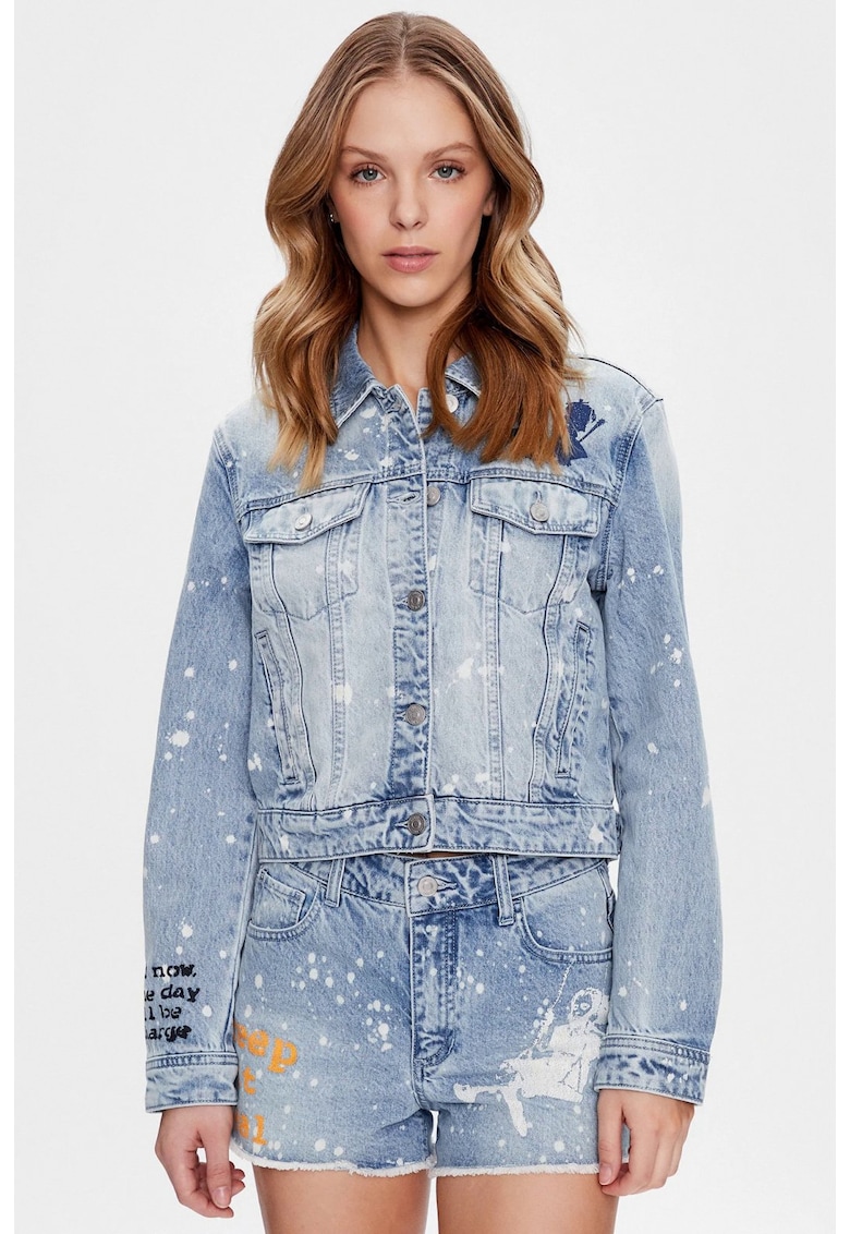 - albastru deschis Imprimeu: text Material: denim Croiala: regular fit Gluga: fara gluga Lungime maneca: maneca lunga Buzunare: 4 Detalii: partea din spate brodata Sistem inchidere: nasturi Compozitie Exterior: 100% bumbac