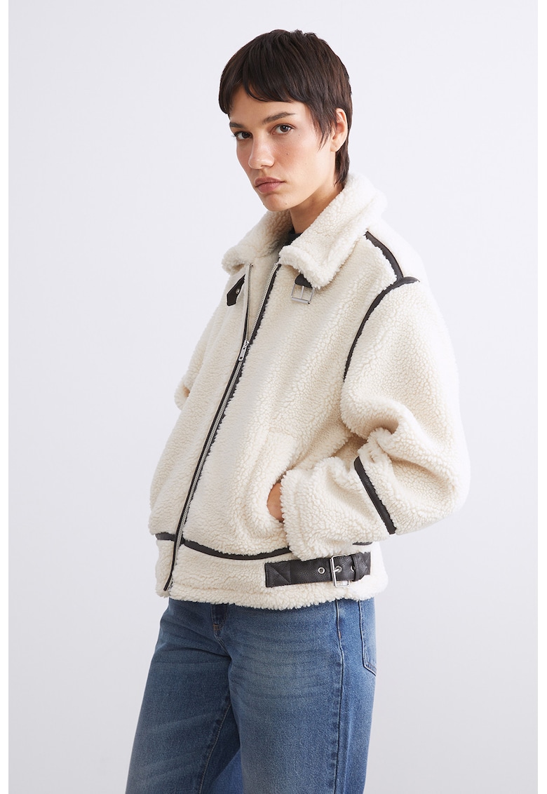 Caracteristici Tip produs: jacheta Culoare: alb fildes Imprimeu: uni Material: poliester Croiala: lejer Guler: cu bareta cu catarama Lungime maneca: maneca lunga Buzunare: 2 Sistem inchidere: fermoar Compozitie Exterior: 100% poliester Captuseala: 100% poliester