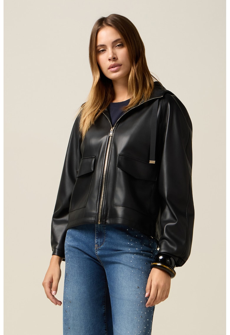 Caracteristici Tip produs: jacheta Culoare: negru Imprimeu: uni Material: piele ecologica Croiala: regular fit Gluga: cu gluga Maneci: cu mansete elastice Lungime maneca: maneca lunga Buzunare: cu clapa Sistem inchidere: fermoar Compozitie Exterior: 100% poliester