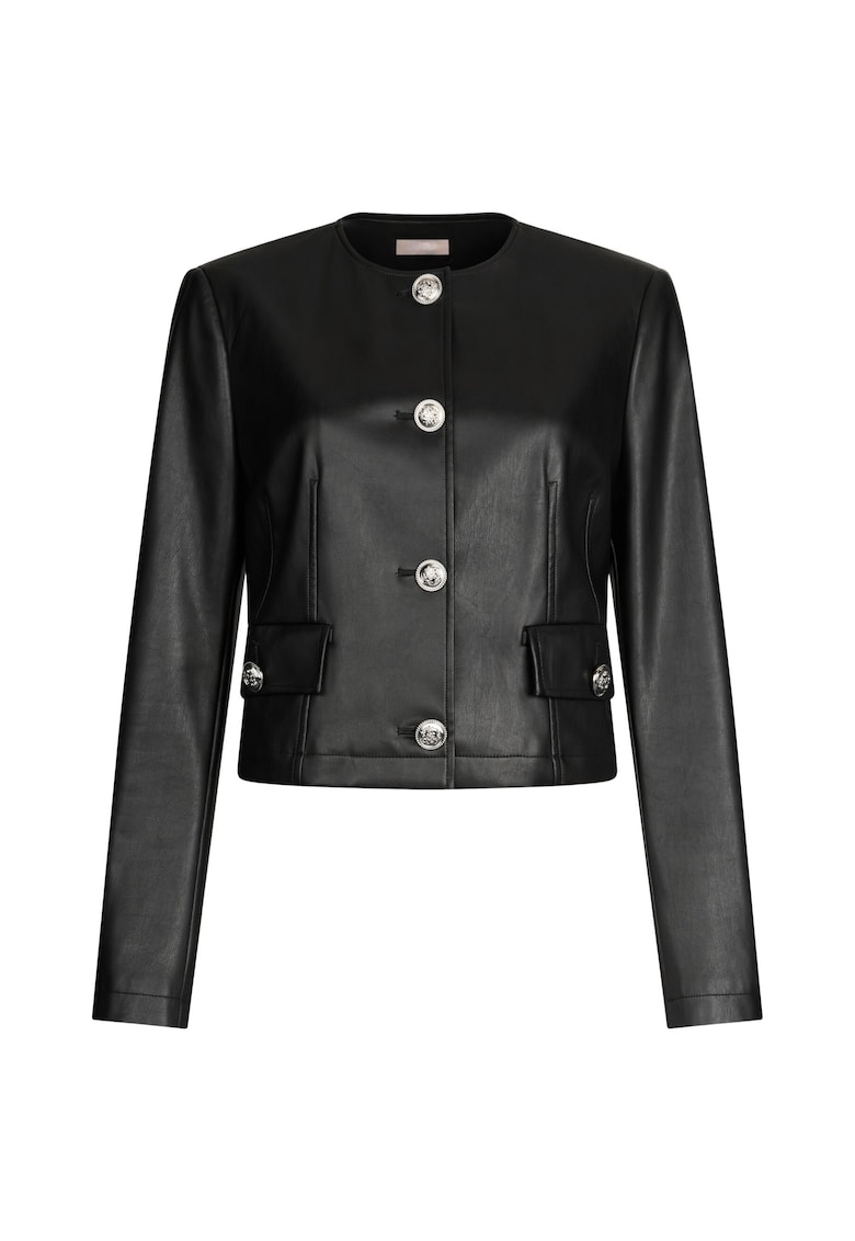 Caracteristici Tip produs: jacheta Culoare: negru Imprimeu: uni Material: piele ecologica Croiala: regular fit Gluga: fara gluga Lungime maneca: maneca lunga Buzunare: 2 cu clapa Sistem inchidere: nasturi Compozitie Exterior: 100% poliester cu pelicula de poliuretan