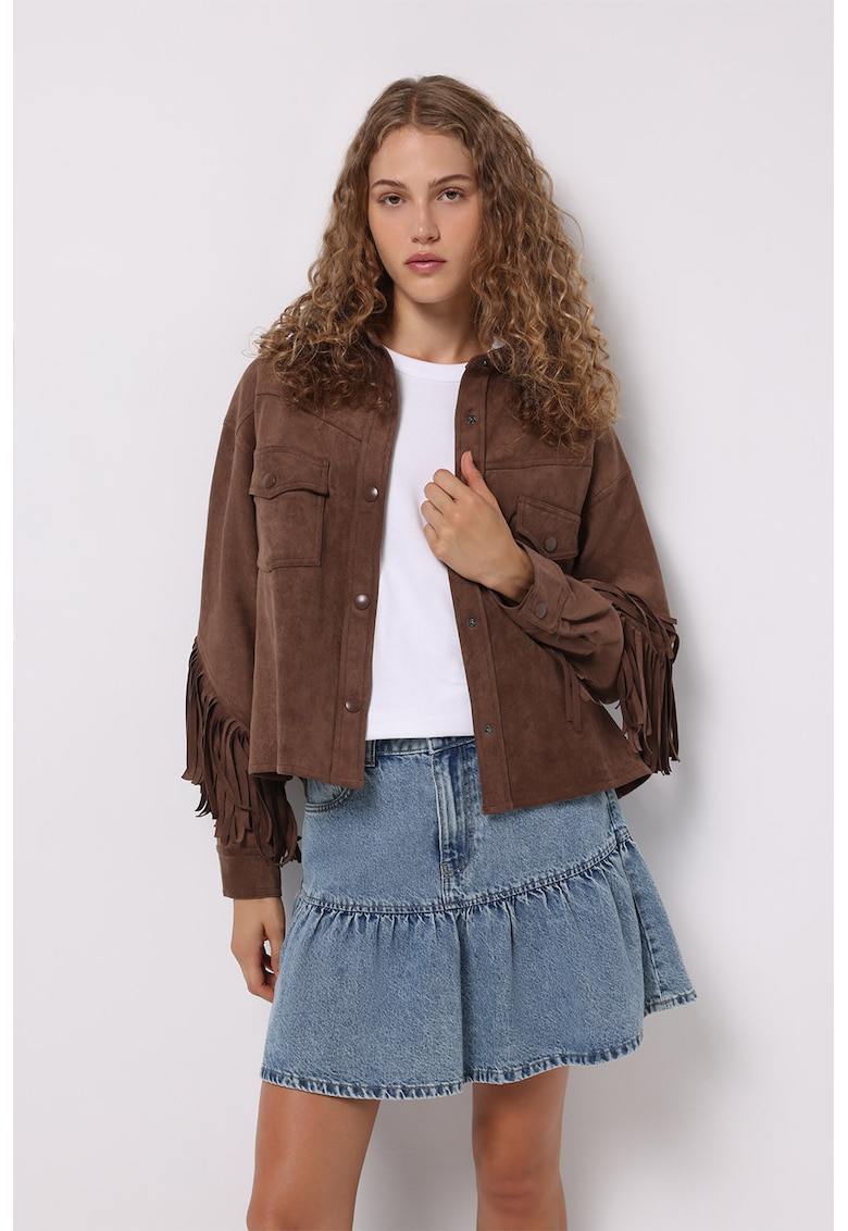 Caracteristici Tip produs: jacheta Culoare: maro Imprimeu: uni Material: poliester Croiala: regular fit Guler: ascutit Gluga: fara gluga Lungime maneca: maneca lunga Buzunare: 2 cu clapa pe piept Detalii: franjuri Sistem inchidere: capse Compozitie Exterior: 93% poliester