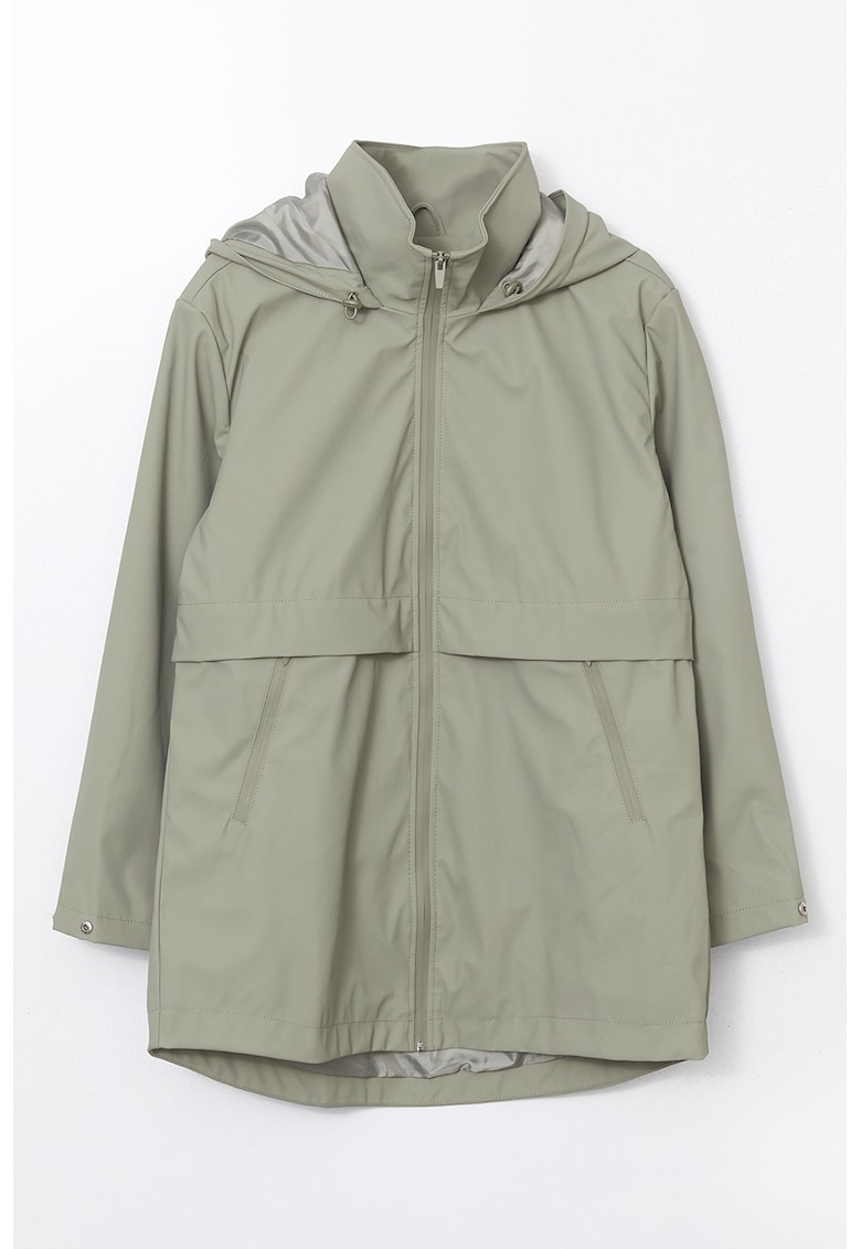 Caracteristici Tip produs: geaca Culoare: grej Imprimeu: uni Material: sintetic Croiala: lejer Guler: inalt Gluga: cu gluga Lungime maneca: maneca lunga Buzunare: 2 laterale Sistem inchidere: fermoar Compozitie Exterior: 100% poliester cu 100% invelis din poliuretan Captuseala: 100% poliester