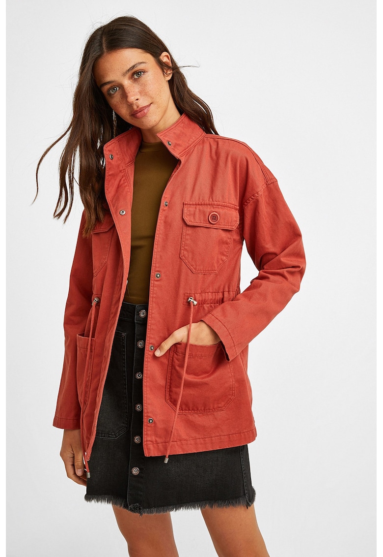 Caracteristici Tip produs: jacheta Culoare: coral Imprimeu: uni Material: bumbac Croiala: regular fit Guler: mediu Gluga: fara gluga Lungime maneca: maneca lunga Buzunare: 4 frontale Detalii: talie ajustabila Sistem inchidere: capse Compozitie Exterior: 100% bumbac