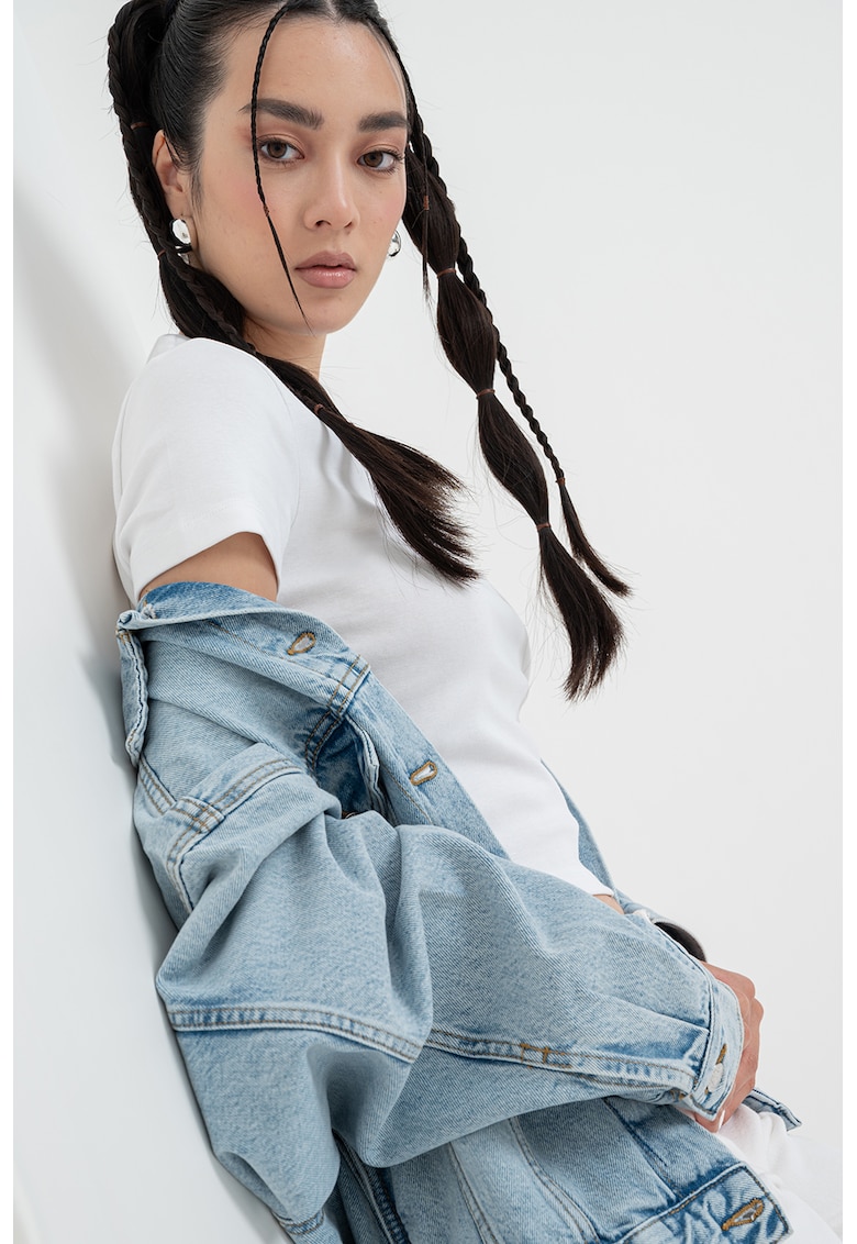Caracteristici Tip produs: jacheta Culoare: albastru melange Imprimeu: uni Material: bumbac Croiala: lejer Guler: clasic Gluga: fara gluga Maneci: maneci cazute Lungime maneca: maneca lunga Buzunare: 2 cu clapa si nasturi pe piept Sistem inchidere: nasturi Compozitie Exterior: 100% bumbac Info model Modelul poarta un produs de marimea S. Marimi model: 170 cm inaltime