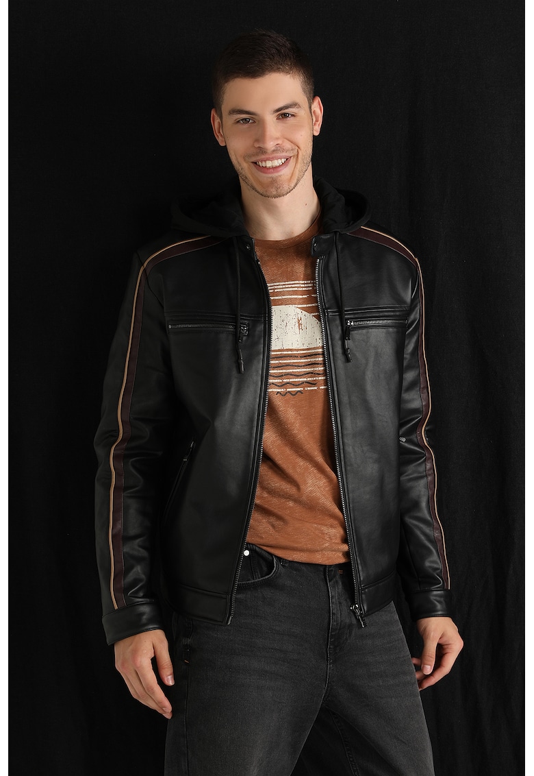 Caracteristici Culoare: negru Material: piele ecologica Croiala: slim fit Imprimeu: uni Gluga: cu gluga Lungime maneca: maneca lunga Buzunare: buzunare exterioare Detalii: gluga detasabila Sistem inchidere: fermoar Compozitie Exterior: 92% poliester