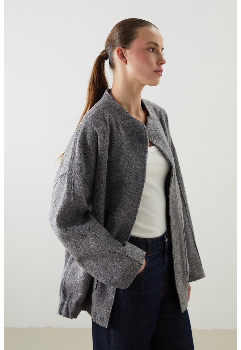Caracteristici Tip produs: jacheta Culoare: gri inchis melange Imprimeu: uni Material: sintetic Croiala: supradimensionat Guler: baseball Gluga: fara gluga Lungime maneca: maneca lunga Buzunare: aplicatie frontala Sistem inchidere: capse Compozitie Exterior: 100% poliester