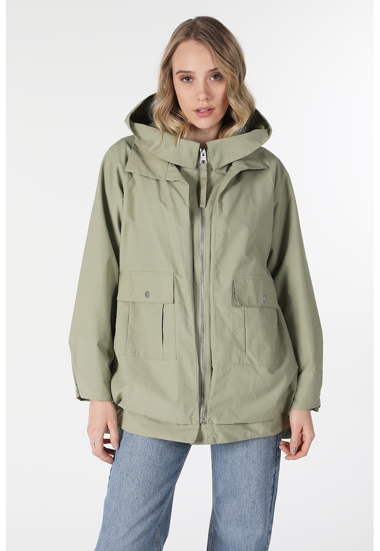 Caracteristici Tip produs: jacheta Culoare: verde sparanghel Imprimeu: uni Material: sintetic Croiala: lejer Gluga: cu gluga Maneci: mansete cu capse Lungime maneca: maneca lunga Buzunare: 2 buzunare supradimensionate pe partea din fata Detalii: material usor Sistem inchidere: fermoar Compozitie Exterior: 100% poliamida Captuseala: 100% poliester