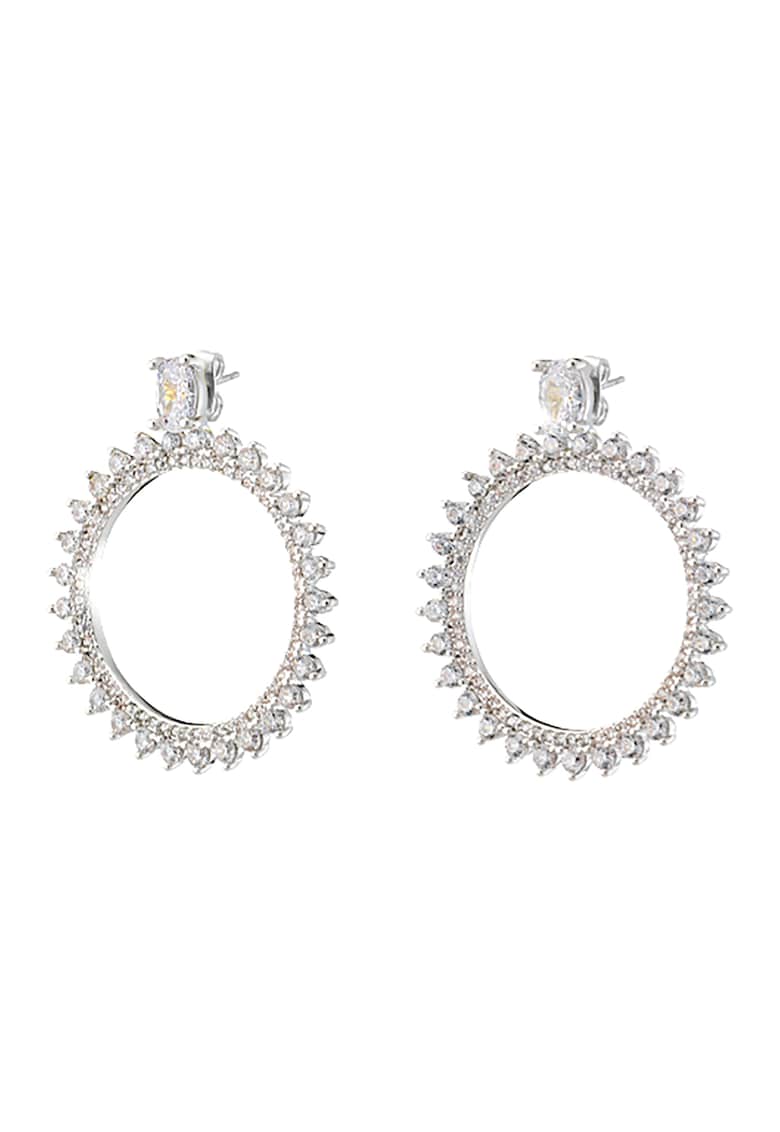 Caracteristici Tip produs: cercei Material: metal Culoare: argintiu Ambalaj: produsul este livrat in ambalaj personalizat . Compozitie Compozitie: metal Pietre: zirconiu Placaj: rodiu Dimensiuni Diametru: 2.7 cm Lungime: 3.3 cm Informatii suplimentare: a se evita contactul cu alcool