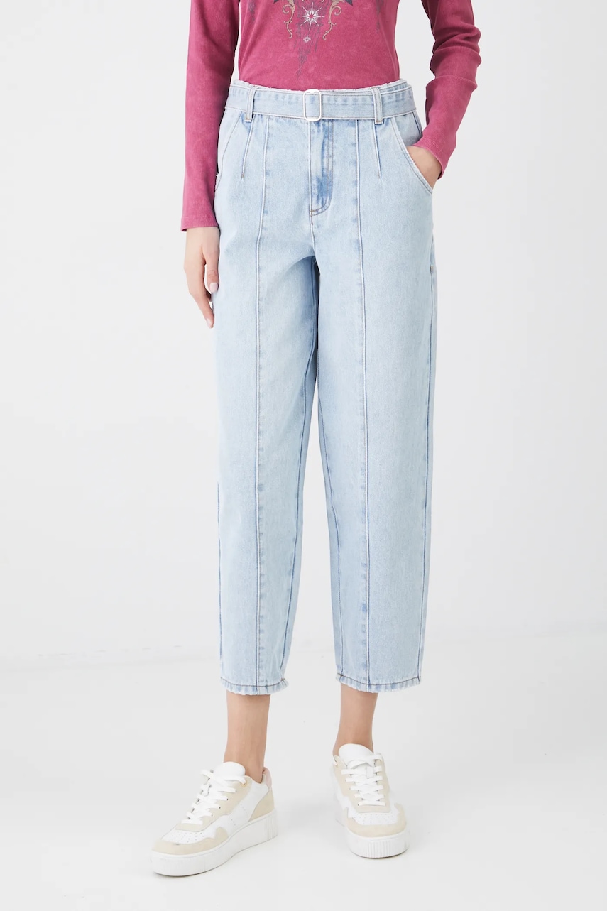 - blugi mai largi în jurul șoldurilor, al căror picior se îngustează ușor în jos. Această croială subliniază linia taliei, o subțiază optic și vă permite să echilibrați proporțiile în siluetă. Sunt ideale pentru a crea un stil mai formal, menținând în același timp slăbirea casual pe care o oferă blugii.