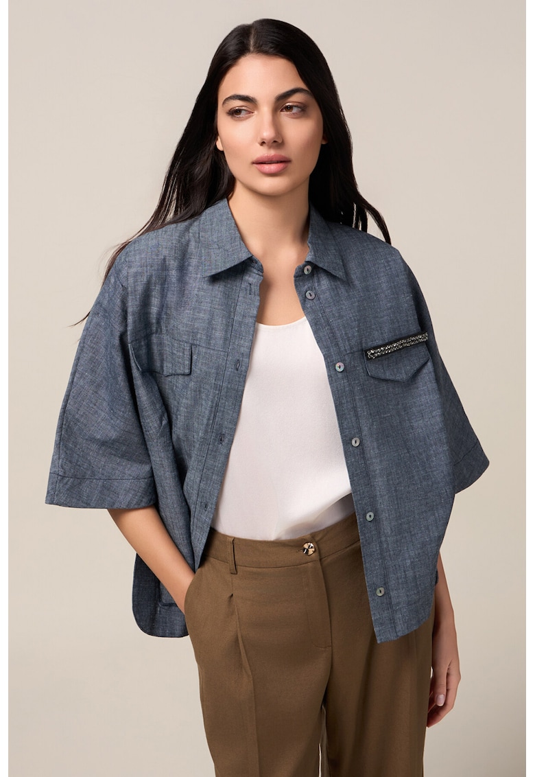 - in Croiala: supradimensionat Guler: ascutit Lungime maneca: maneca medie Buzunare: 2 pe piept Sistem inchidere: nasturi Compozitie Exterior: 80% bumbac