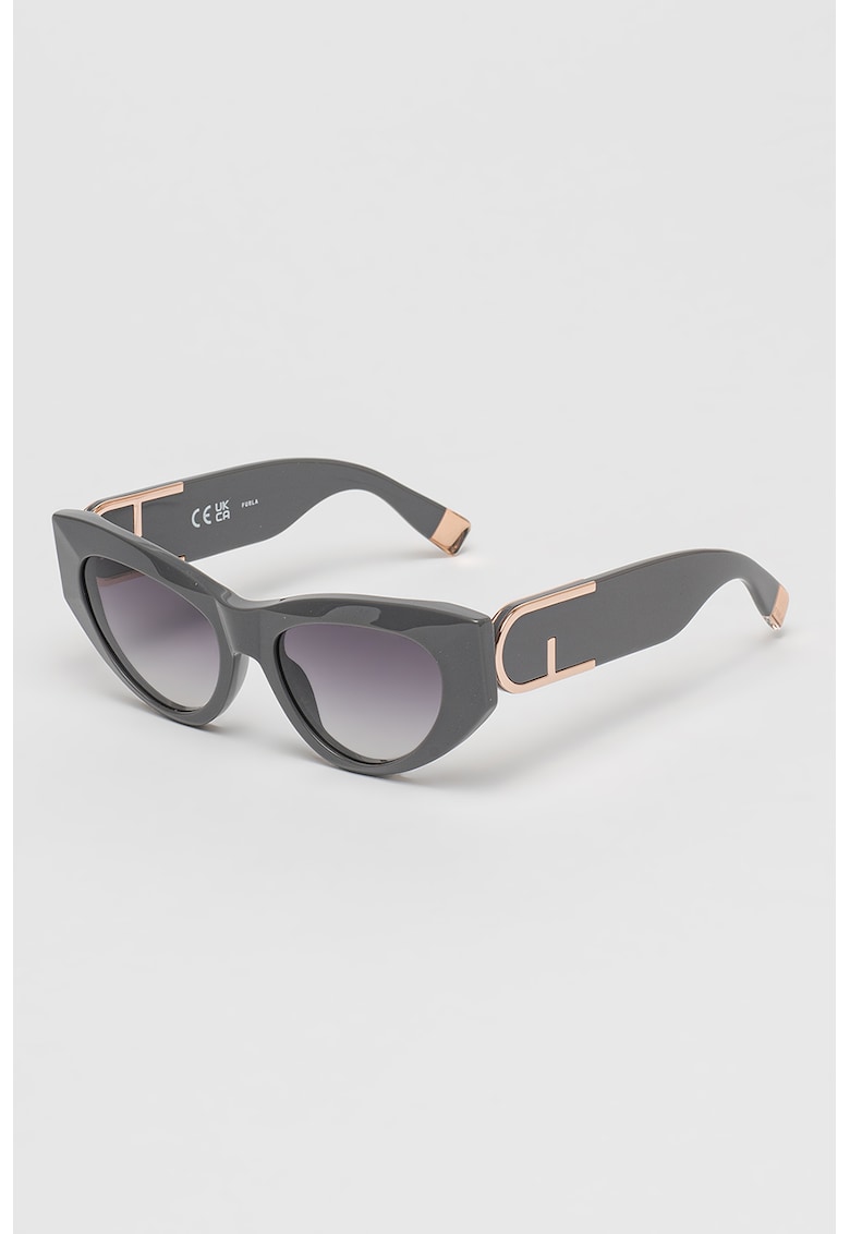 Caracteristici Stil: cat-eye Culoare: gri deschis Culoare lentila: gri Tip lentila: degrade Protectie UV: 400 Ambalaj: produsul se livreaza in ambalaj personalizat. Compozitie Material rama: plastic Material lentile: plastic Dimensiuni Latime lentila: 54 mm Marime punte nazala: 18 mm Lungime brat: 140 mm