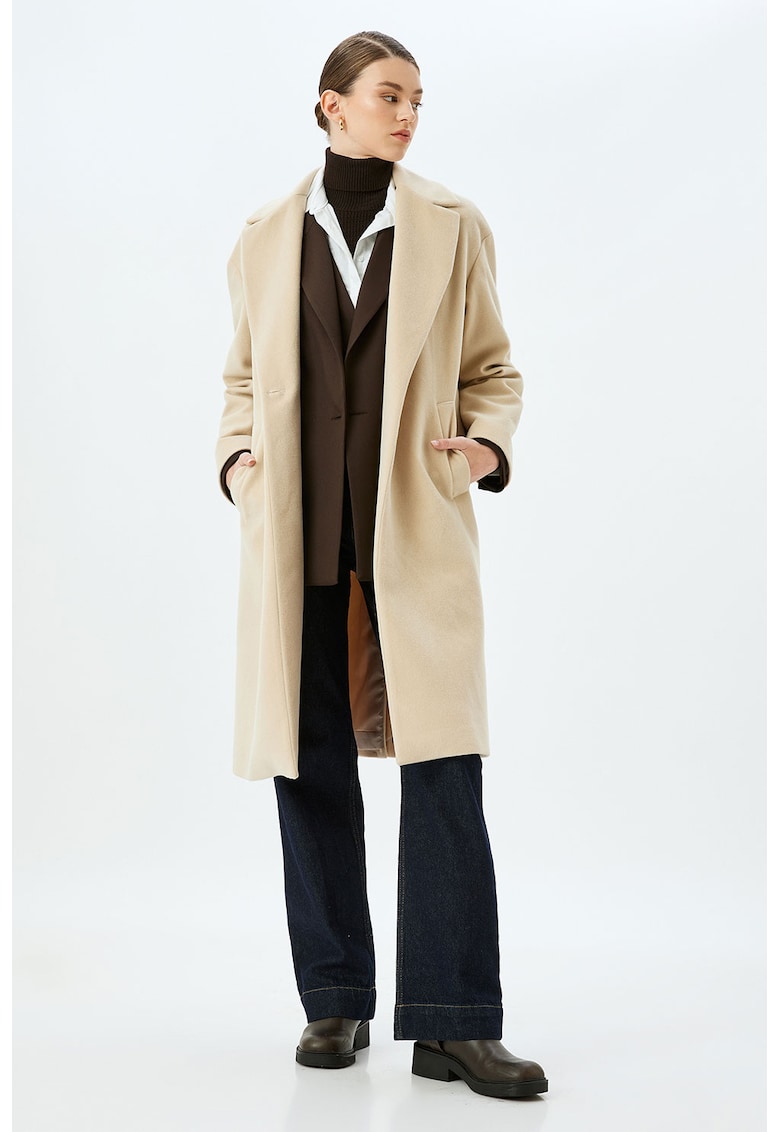 Caracteristici Tip produs: palton Culoare: crem Imprimeu: uni Stil: casual Material: sintetic Croiala: regular fit Guler: cu revere Lungime maneca: maneca lunga Sistem inchidere: nasturi Compozitie Exterior: 100% poliester Captuseala: 100% poliester Detalii material: acoperire: 100% poliamida