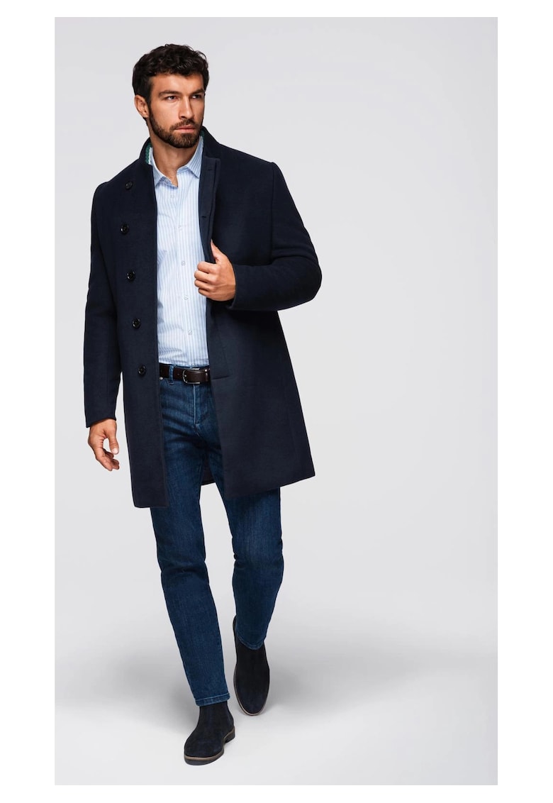 Caracteristici Tip produs: palton Culoare: albastru inchis Material: poliester Stil: elegant Imprimeu: uni Croiala: regular fit Detalii: guler inalt Sistem inchidere: nasturi Compozitie Exterior: 90% poliester