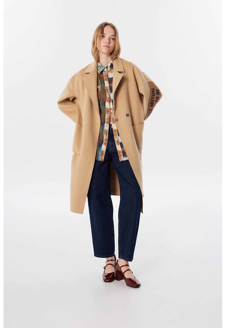 Caracteristici Tip produs: palton Culoare: camel Imprimeu: text Stil: casual Material: lana Croiala: lejer Guler: cu revere Lungime maneca: maneca lunga Buzunare: aplicatie frontala Detalii: slit pe partea din spate