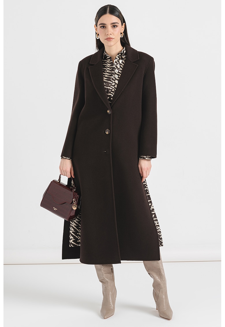 Caracteristici Tip produs: palton Culoare: maro inchis Imprimeu: uni Stil: casual Material: lana Croiala: regular fit Guler: cu revere decupate Lungime maneca: maneca lunga Buzunare: 2 laterale Detalii: slituri laterale