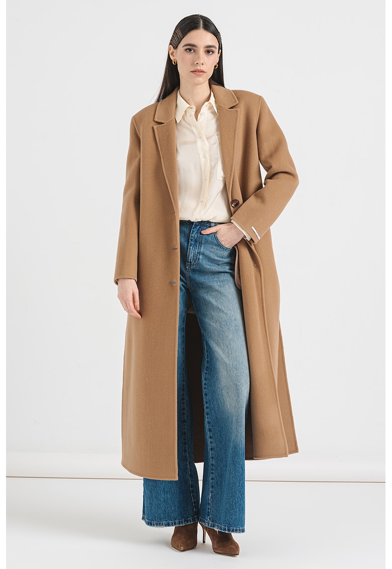 Caracteristici Tip produs: palton Culoare: camel Imprimeu: uni Stil: casual Material: lana Croiala: regular fit Guler: cu revere decupate Lungime maneca: maneca lunga Buzunare: 2 laterale Detalii: slituri laterale