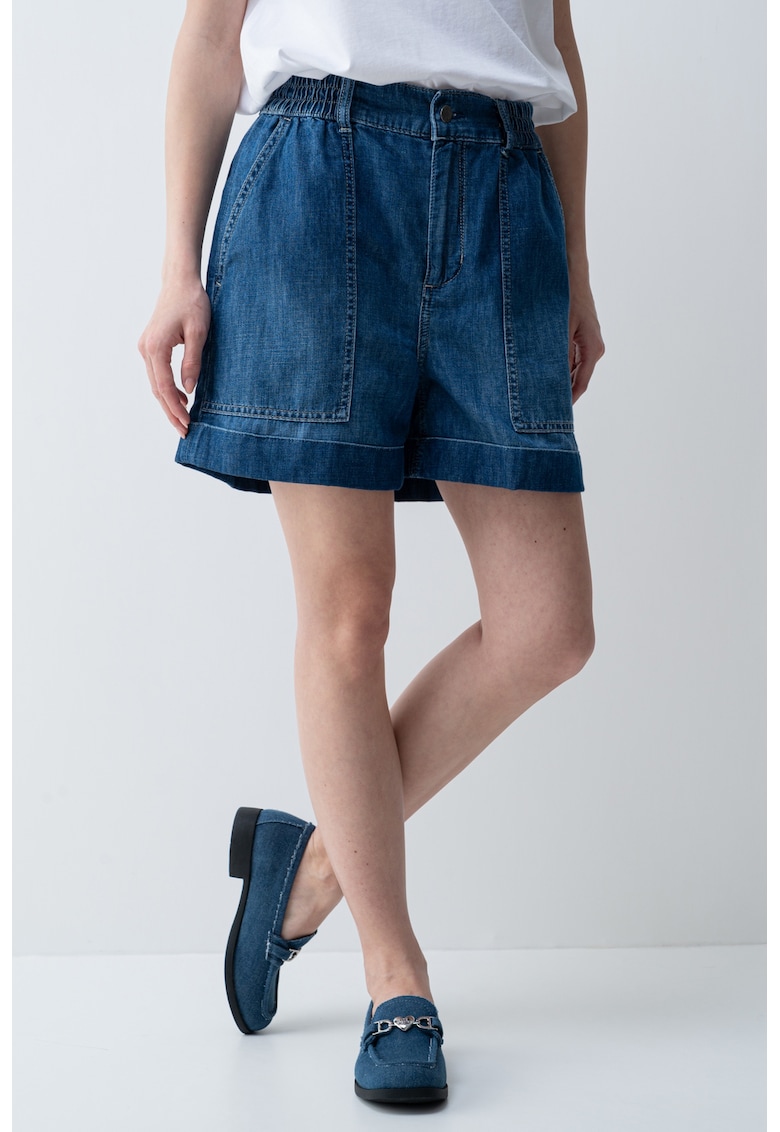 Caracteristici Culoare: albastru royal Imprimeu: uni Croiala: croiala ampla Material: denim Talie: inalta Lungime: scurti Sistem inchidere: fermoar Compozitie Exterior: 67% bumbac