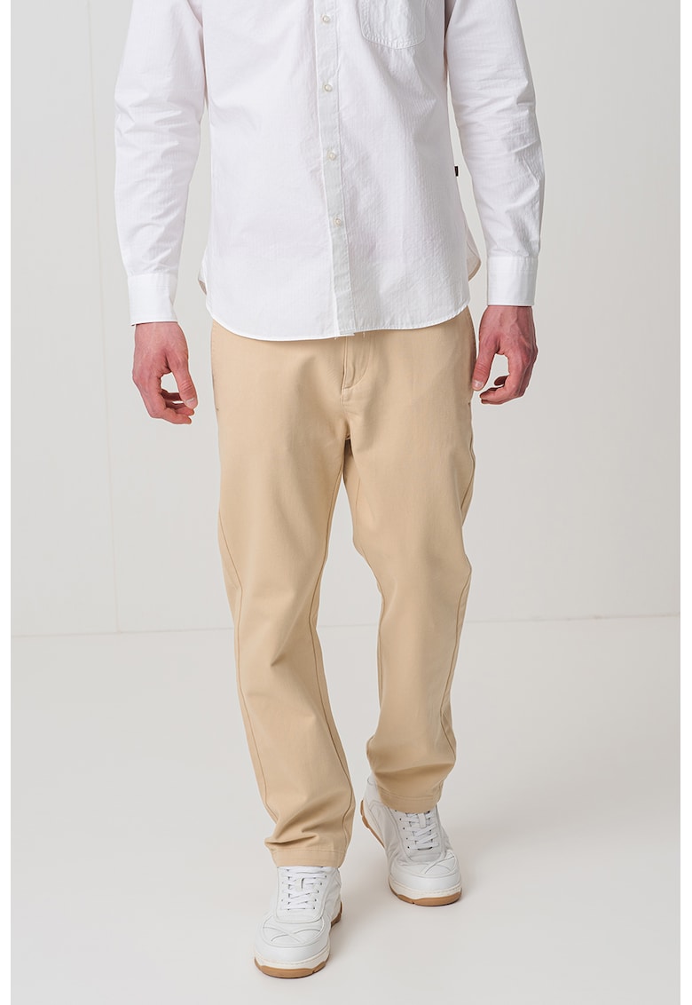 Caracteristici Culoare: bej Imprimeu: uni Material: bumbac Stil: casual Croiala: regular fit Talie: medie Lungime: lungi Sistem inchidere: fermoar Compozitie Exterior: 100% bumbac Info model Modelul poarta un produs de marimea W32-L32. Marimi model: 190 cm inaltime