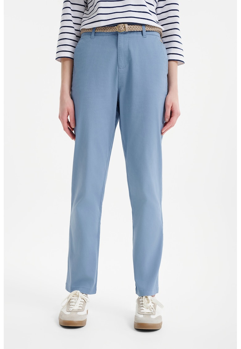 Caracteristici Culoare: albastru pastel Stil: casual Material: bumbac Imprimeu: uni Croiala: dreapta Lungime: lungi Talie: medie Detalii: curea in talie Buzunare: 3 Sistem inchidere: fermoar Compozitie Exterior: 98% bumbac