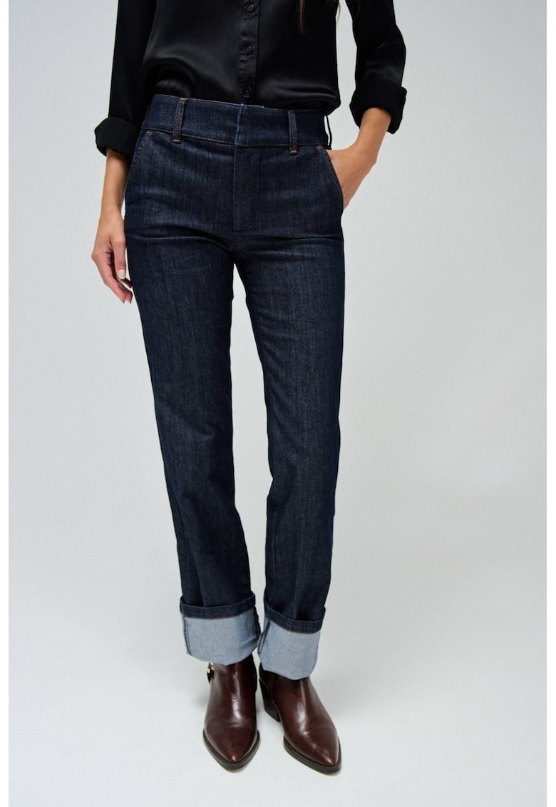 Caracteristici Culoare: albastru inchis Imprimeu: uni Croiala: dreapta Material: denim Talie: medie Lungime: lungi Buzunare: cu refilet pe partea din spate