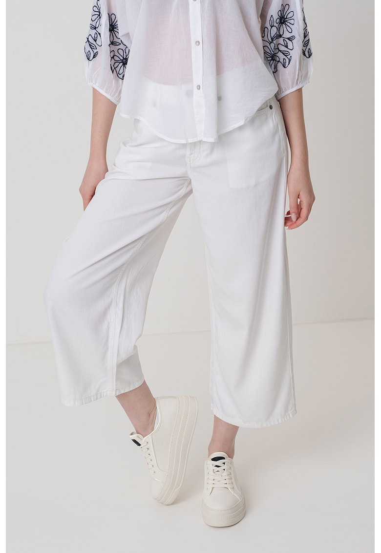 Caracteristici Culoare: alb Stil: casual Material: bumbac Imprimeu: uni Croiala: croiala ampla Lungime: crop Talie: inalta Buzunare: 5 buzunare Sistem inchidere: fermoar