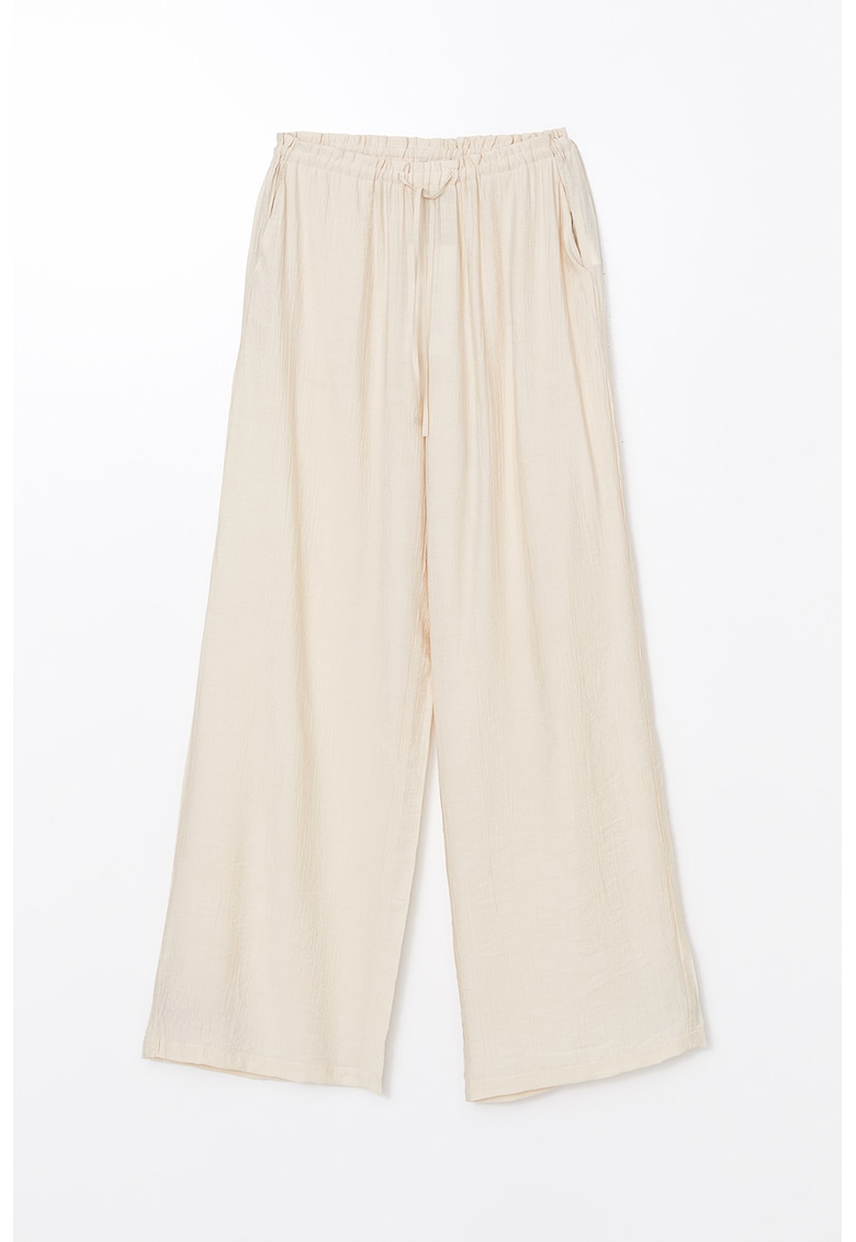 - poliamida Imprimeu: uni Croiala: croiala ampla Lungime: lungi Talie: inalta Detalii: banda elastica in talie cu snur pentru ajustare Buzunare: in cusaturile laterale Sistem inchidere: fara inchidere Compozitie Exterior: 84% viscoza
