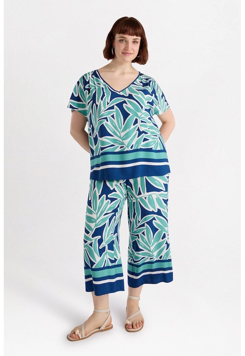 - bleumarin Stil: casual Material: viscoza Imprimeu: tropical Croiala: curvy Lungime: crop Talie: inalta Detalii: acest produs se adreseaza femeilor cu forme pline (plus size). Sistem inchidere: fara inchidere Compozitie Exterior: 100% viscoza
