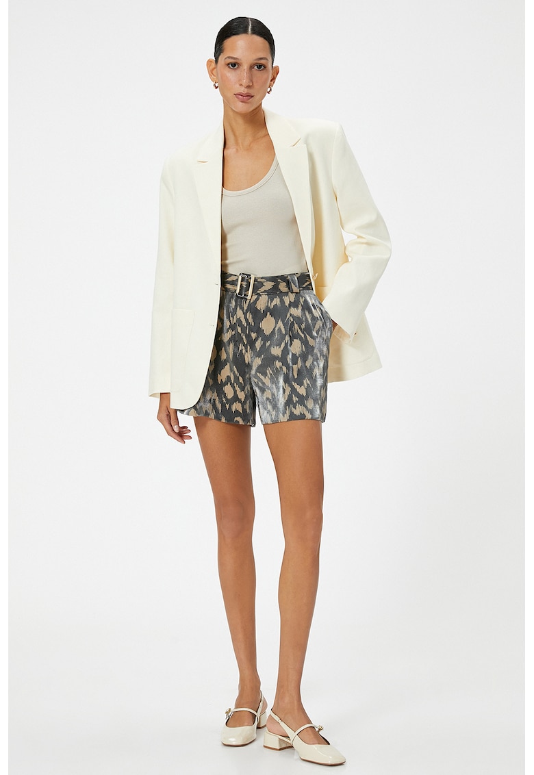 - viscoza Imprimeu: abstract Croiala: regular fit Lungime: scurti Talie: inalta Detalii: curea in talie Buzunare: 2 laterale Sistem inchidere: fermoar Compozitie Exterior: 77% viscoza
