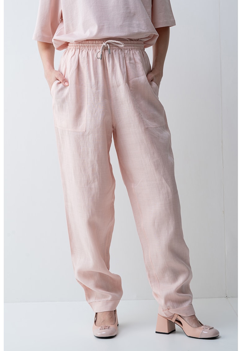 Caracteristici Culoare: roz pal Stil: casual Material: ramie Imprimeu: uni Croiala: conica Lungime: lungi Talie: inalta Buzunare: laterale Sistem inchidere: fara inchidere Compozitie Exterior: 100% ramie Info model Modelul poarta un produs de marimea S. Marimi model: 170 cm inaltime