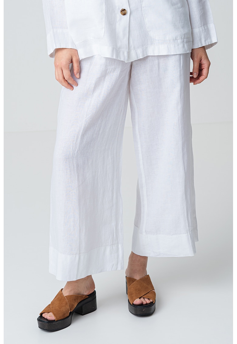 Caracteristici Culoare: alb Stil: casual Material: in Imprimeu: uni Croiala: croiala ampla Lungime: crop Talie: inalta Detalii: pliuri pe partea din fata Buzunare: in cusaturile laterale Sistem inchidere: fermoar Compozitie Exterior: 100% in Info model Modelul poarta un produs de marimea S/38 IT. Marimi model: 173 cm inaltime