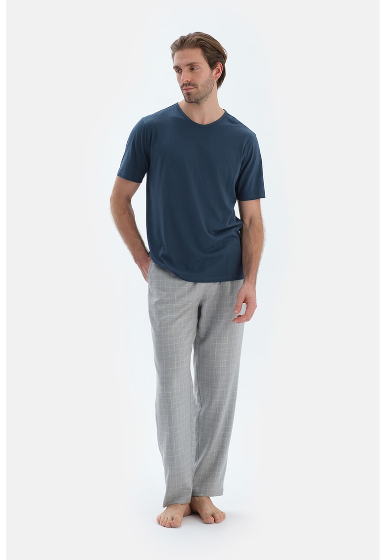 - albastru inchis Imprimeu: carouri Material: viscoza Talie: snur pentru ajustare Lungime pantaloni: lungi Buzunare: laterale Compozitie Exterior: 100% viscoza