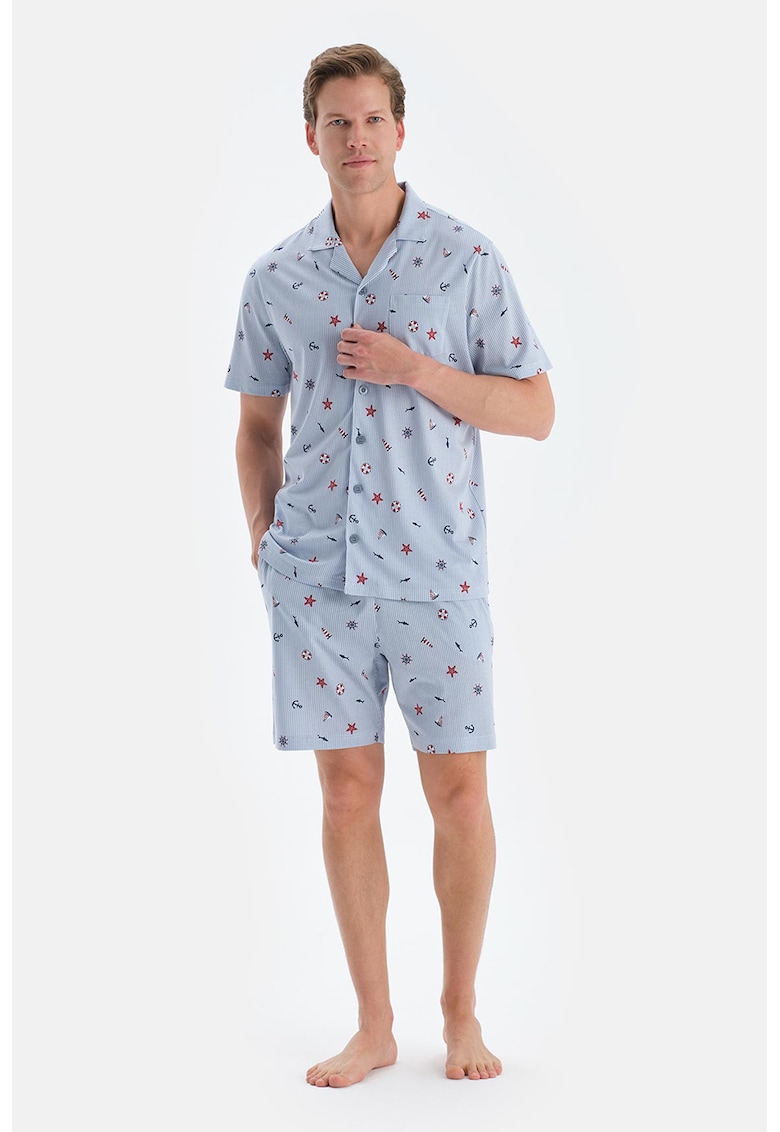 Caracteristici Tip produs: pijama Continut pachet: camasa si pantaloni scurti Culoare: albastru deschis Imprimeu: dungi