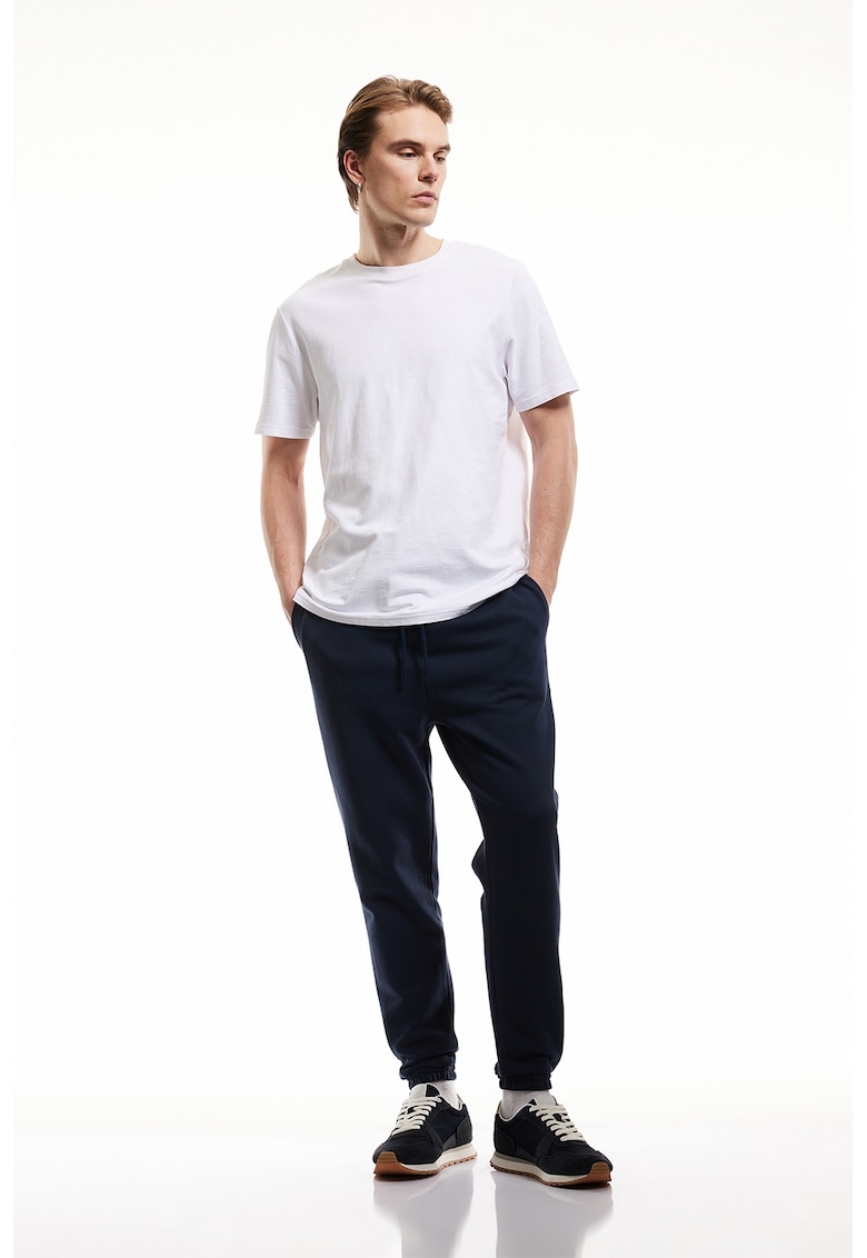 Caracteristici Culoare: bleumarin Imprimeu: uni Material: bumbac Stil: casual Croiala: regular fit Talie: medie Buzunare: 2 oblice Lungime: lungi Detalii: snur pentru ajustare in talie Sistem inchidere: fara inchidere Compozitie Exterior: 100% bumbac