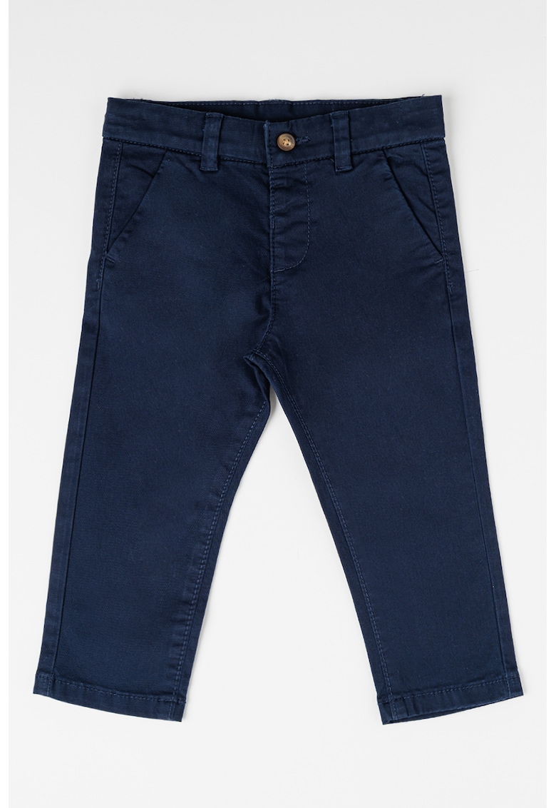 Caracteristici Tip produs: pantaloni lungi Culoare: bleumarin Material: bumbac Stil: casual Imprimeu: uni Croiala: regular fit Talie: medie Buzunare: 2 buzunare Detalii: talie ajustabila Sistem inchidere: nasturi Colectie: primavara