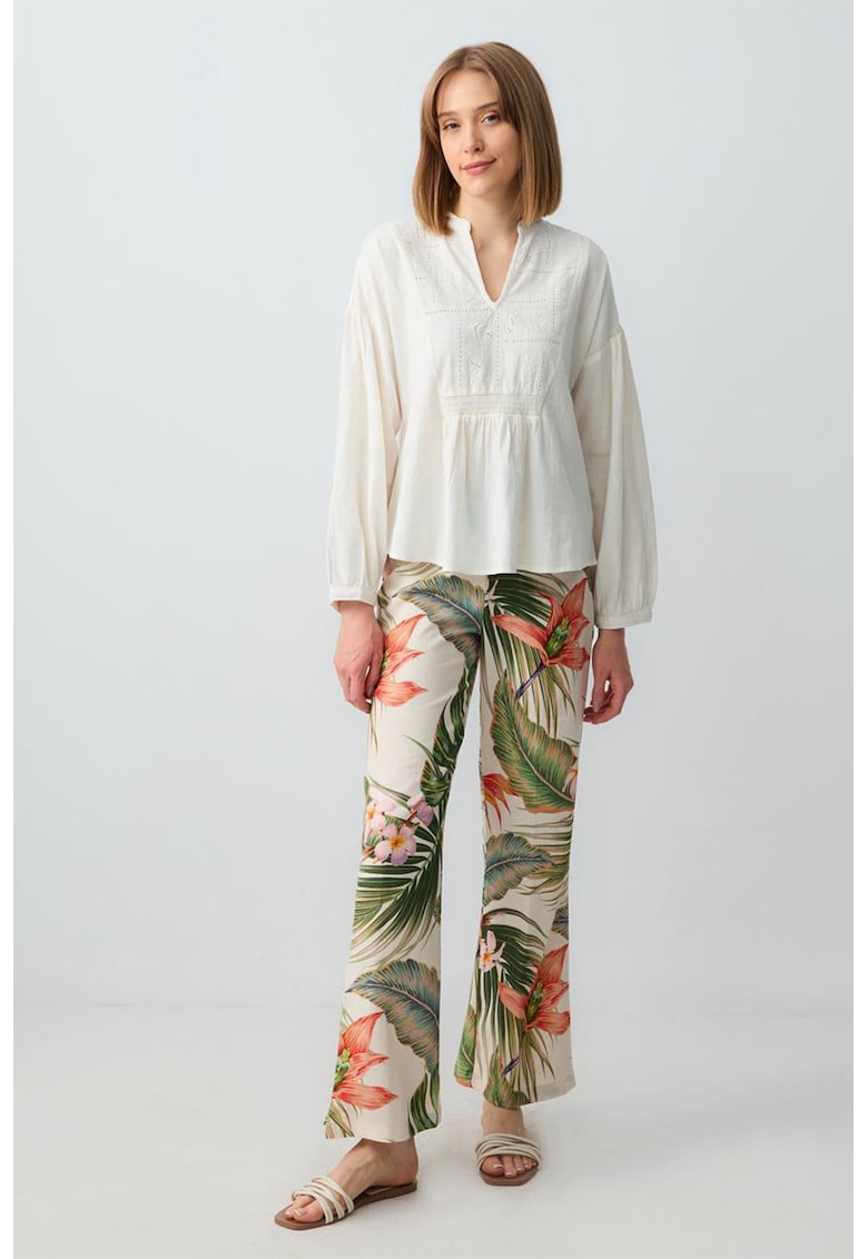 - in Imprimeu: tropical Croiala: evazat Lungime: lungi Talie: inalta Detalii: banda elastica in talie Sistem inchidere: fara inchidere Compozitie Exterior: 63% viscoza